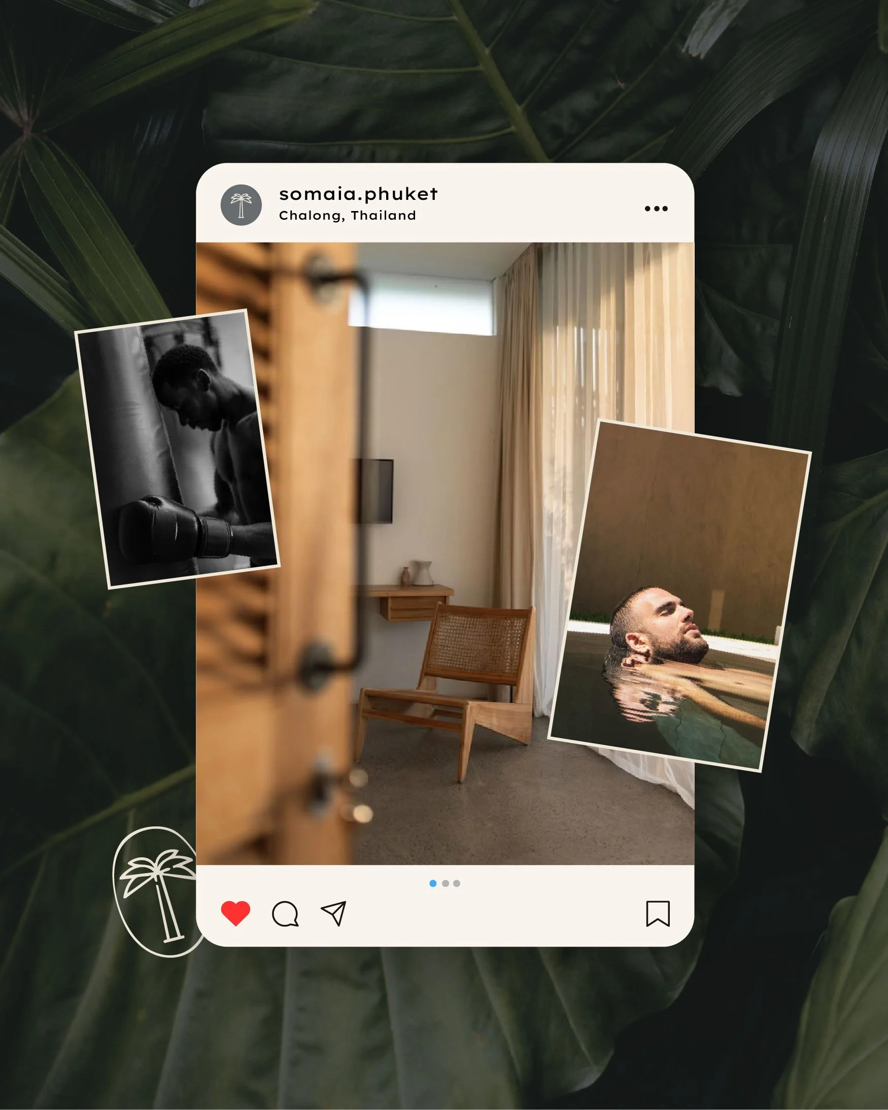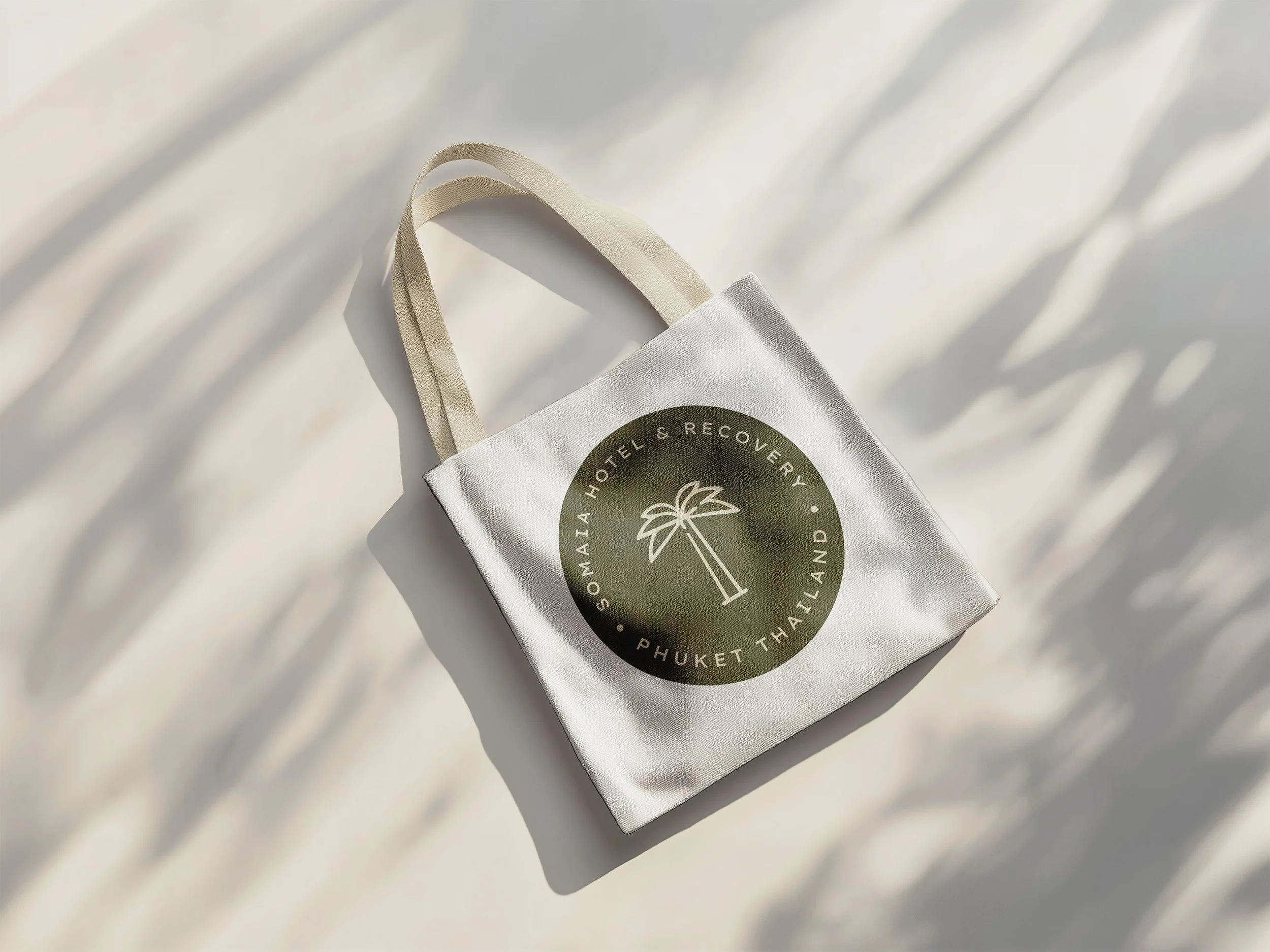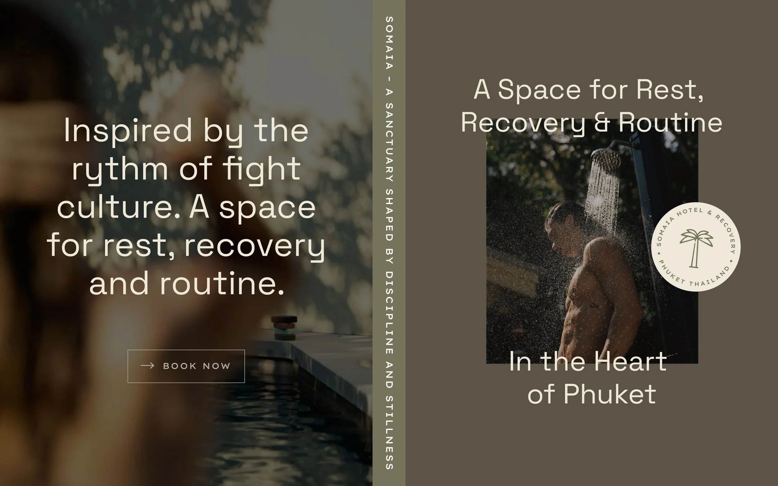Rooted in the philosophy of Thailand’s fight culture, I developed the brand identity for Somaia – a boutique recovery hotel where strength and stillness meet. Designed for guests seeking restoration, Somaia blends daily ritual with a deep connection to nature. The visual identity is earthy, minimal, and intentional: deep greens, warm neutrals, and a palm tree symbol that grounds the brand. Typography is clean and modern, with a subtle masculine tone, using sans-serif fonts that feel both strong and considered. Materials like linen, stone, and textured paper reflect the feel of the hotel’s interiors, while printed collateral and in-room elements remain calm and tactile. This language continues into the digital space, shaping the design of the website and extended brand materials.